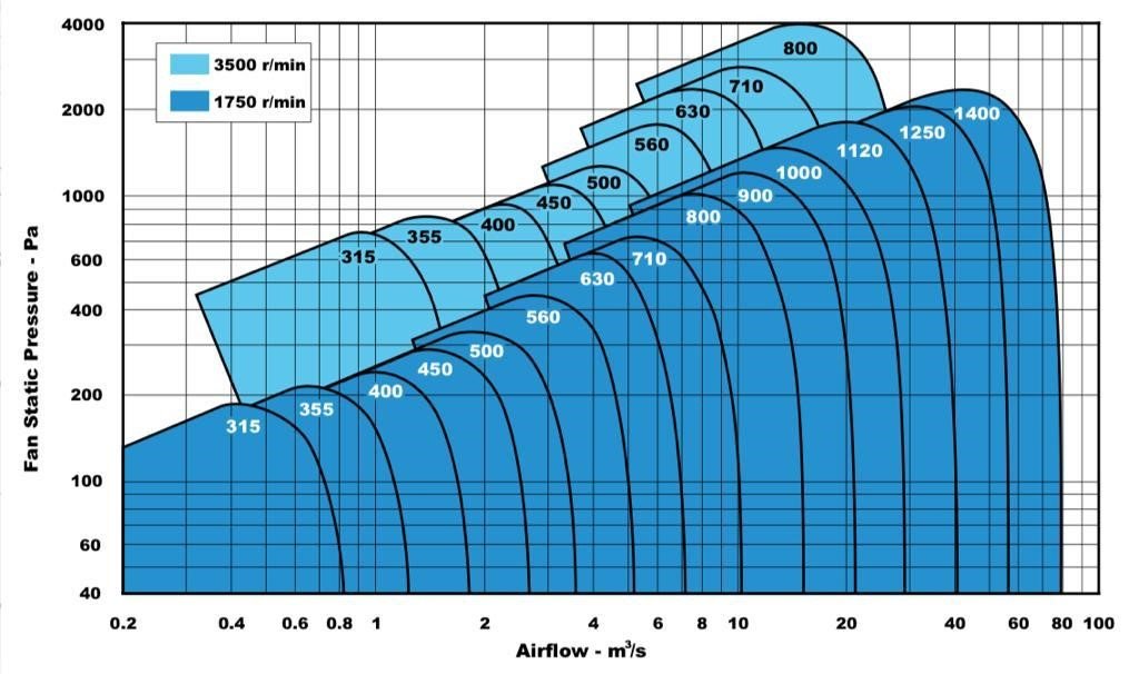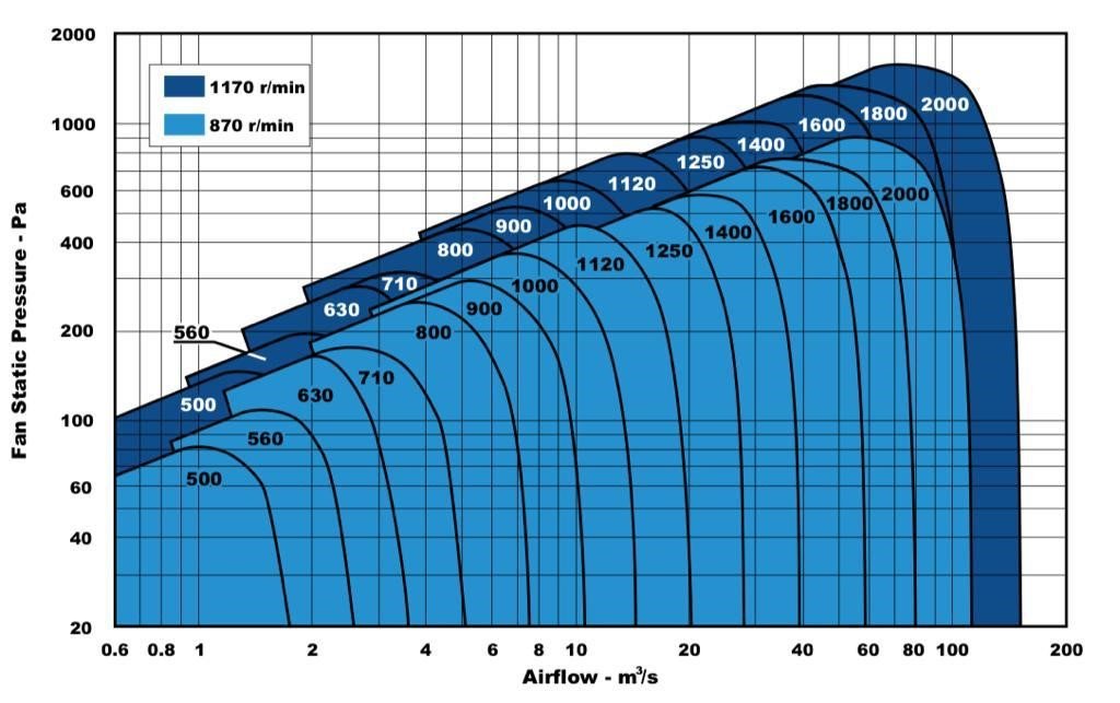The range of axial fan sizes and capacities cover low to medium pressure systems for ventilation
